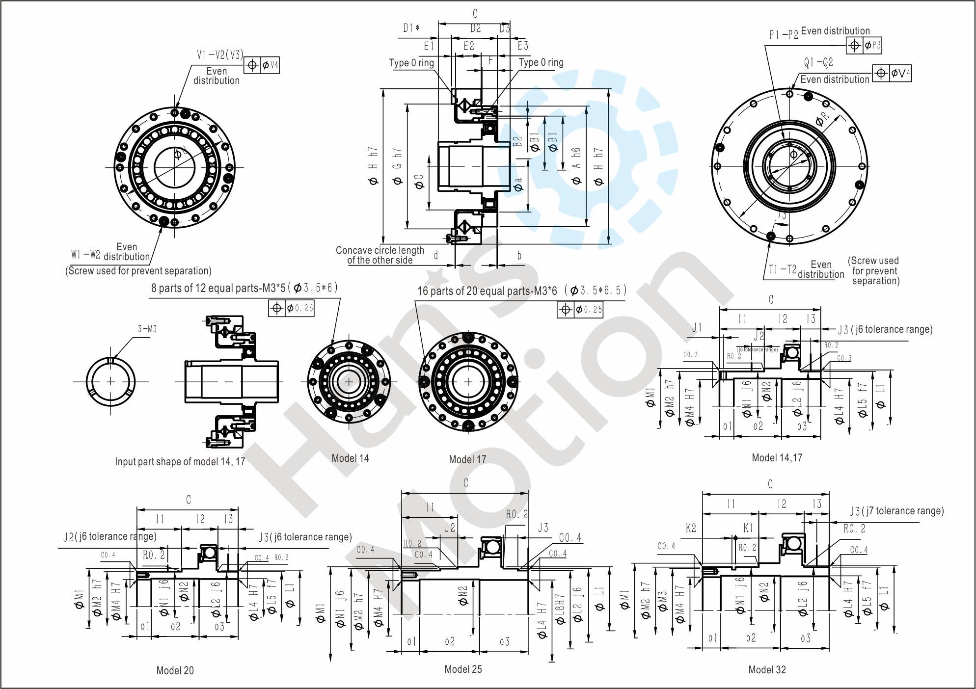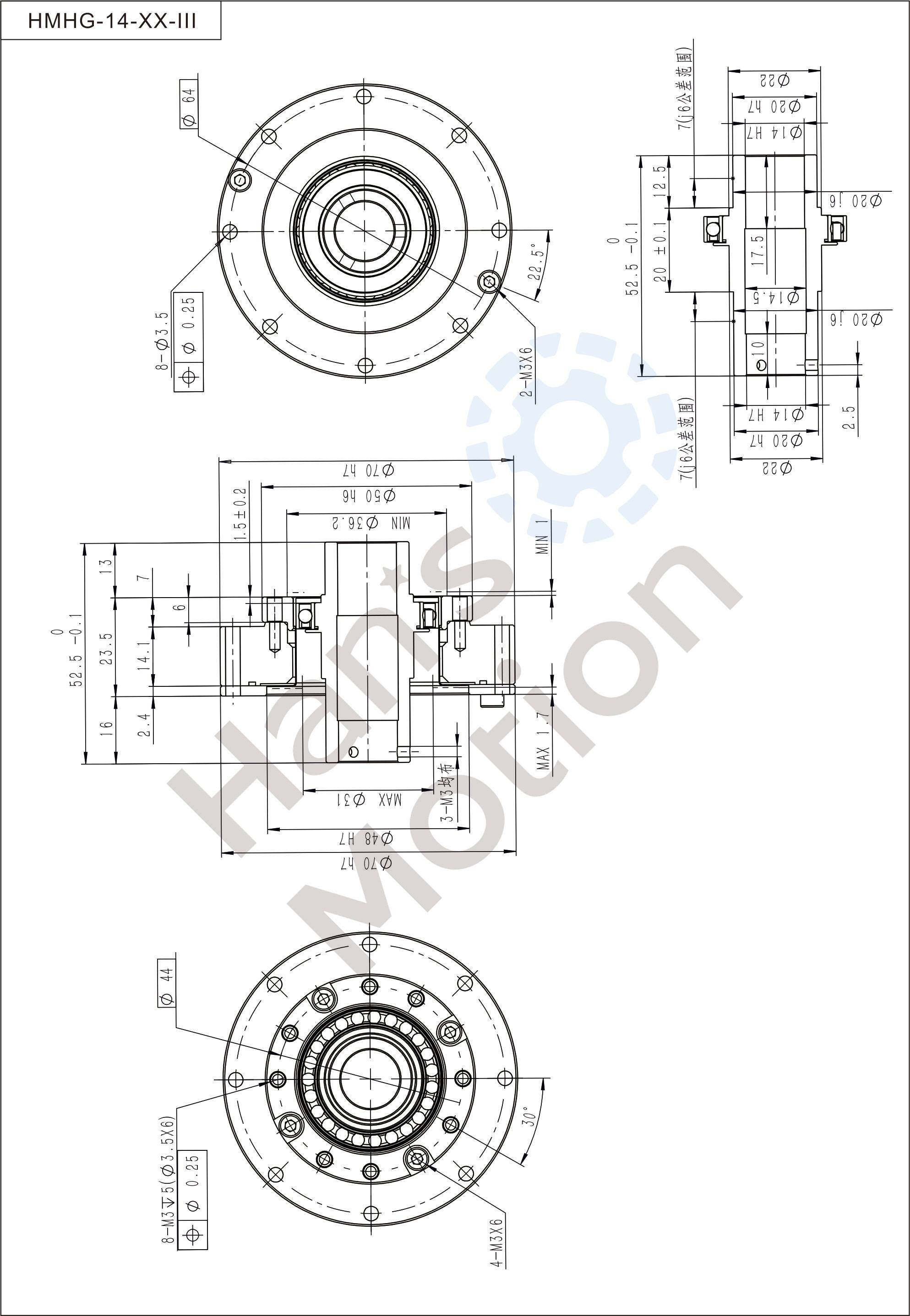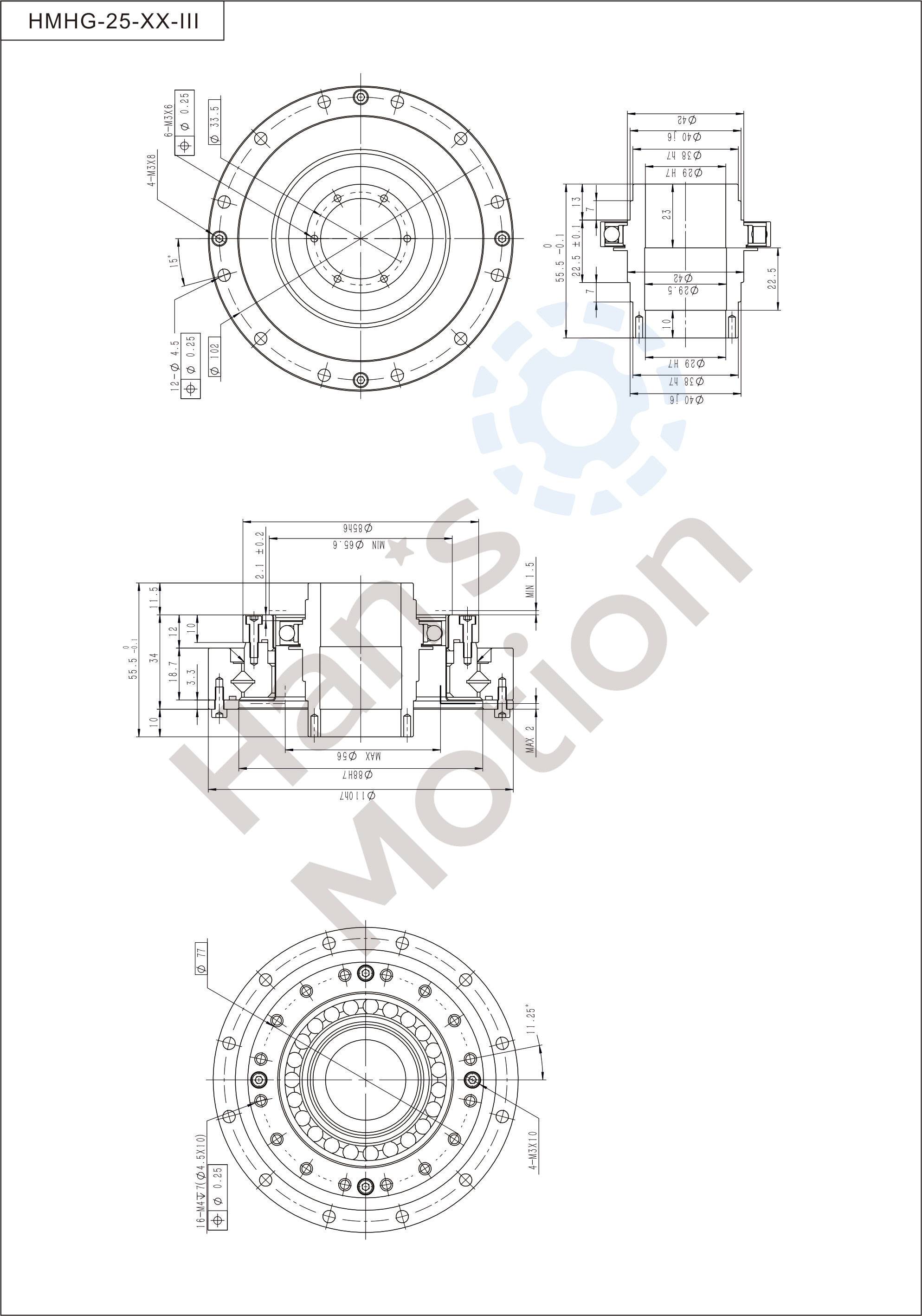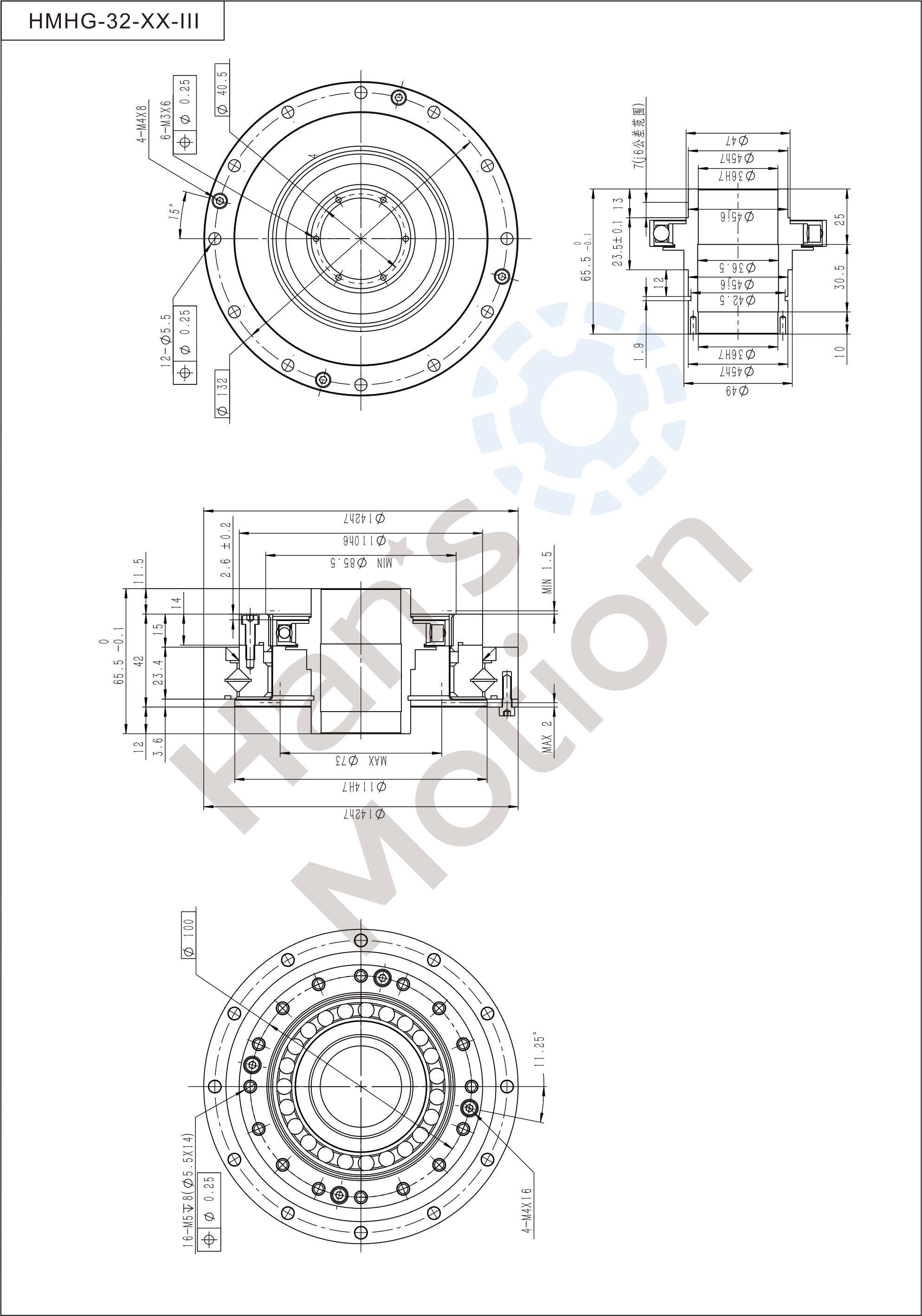 HMHG-III series flexible gear belongs to hollow flanging standard structure and the whole structure is compact. The wave generator adopts large-caliber hollow shaft and crossed roller bearing to bear loads in radial and axial directions. The structure is simple, convenient for user’s customizationand installation.