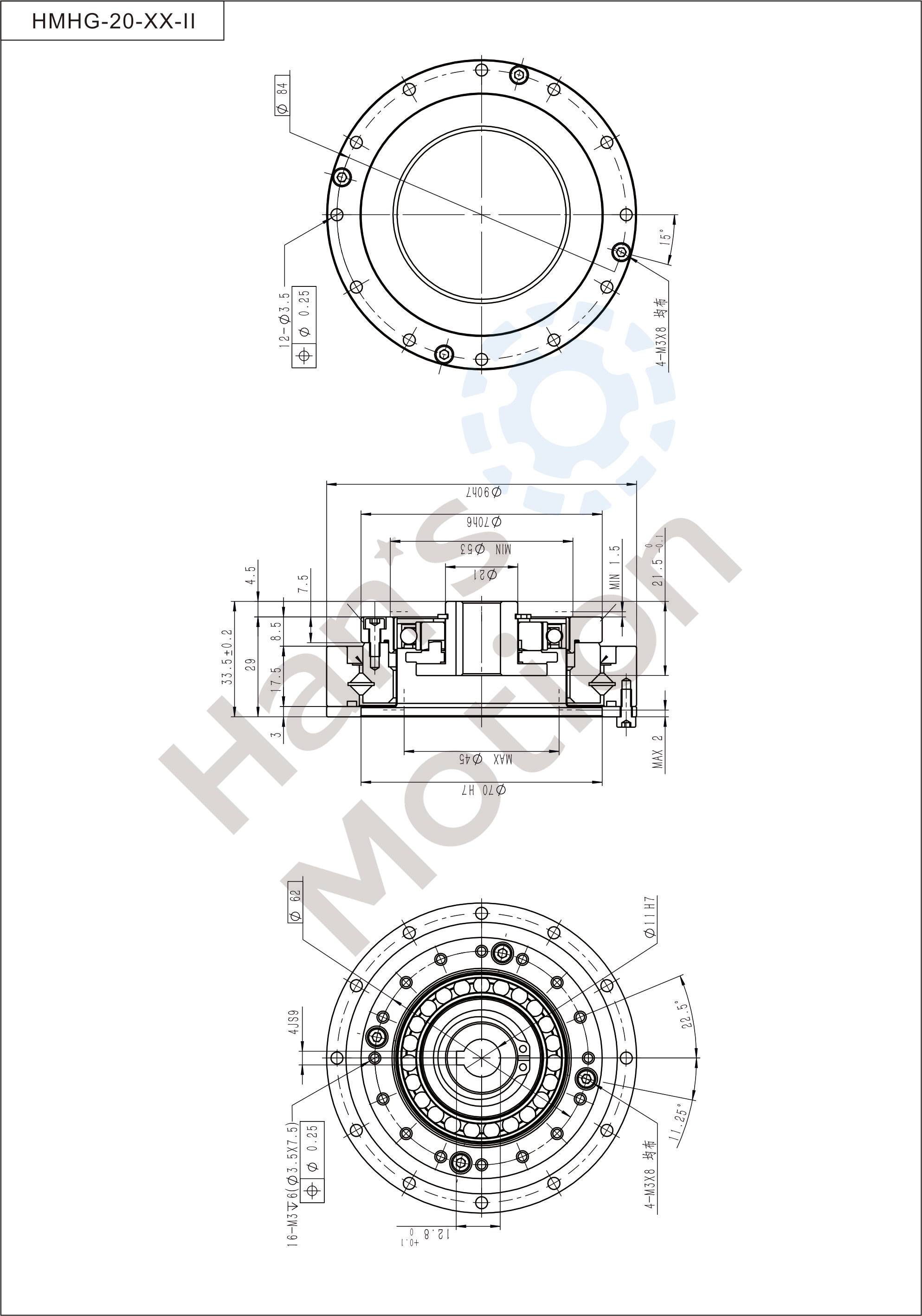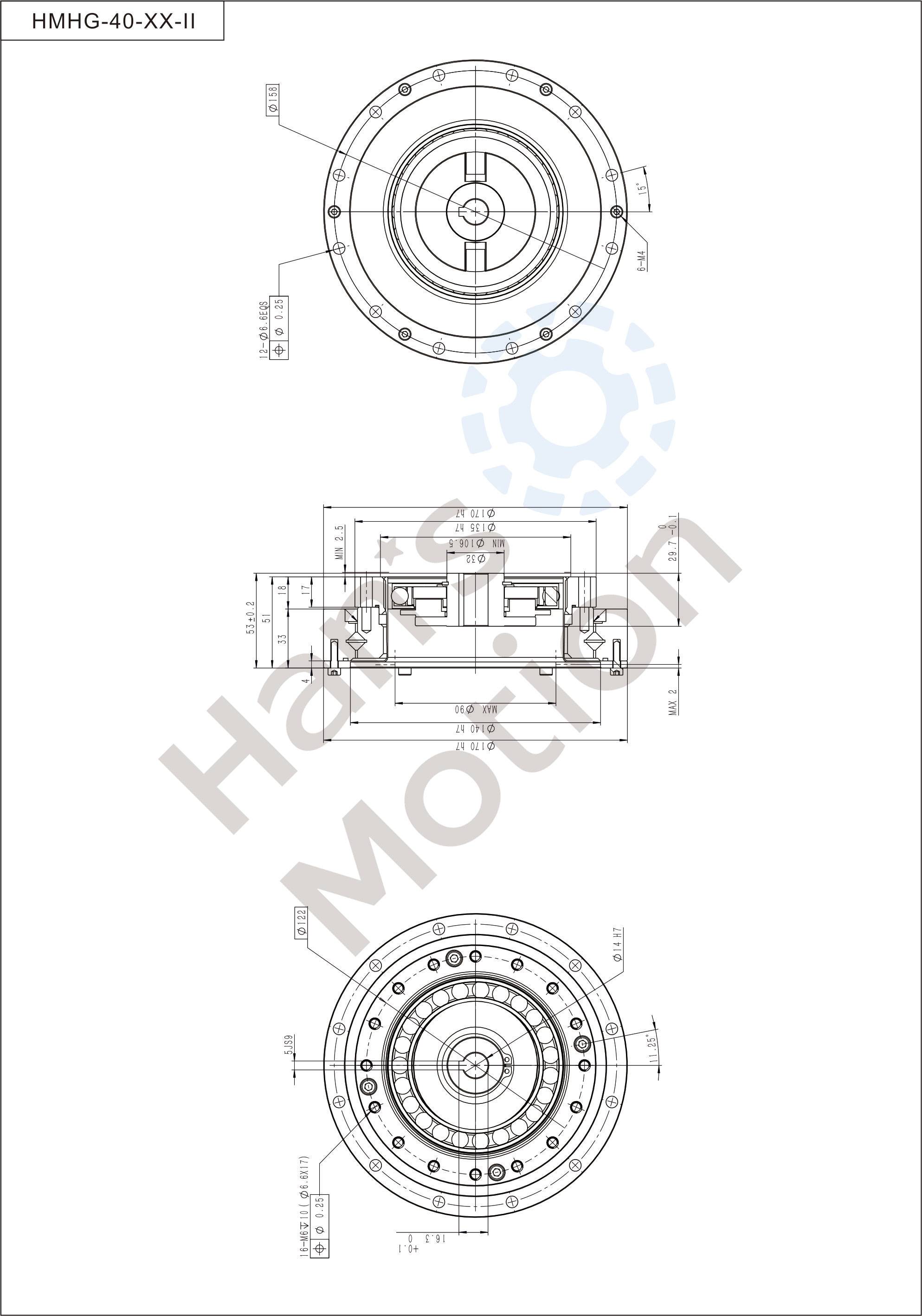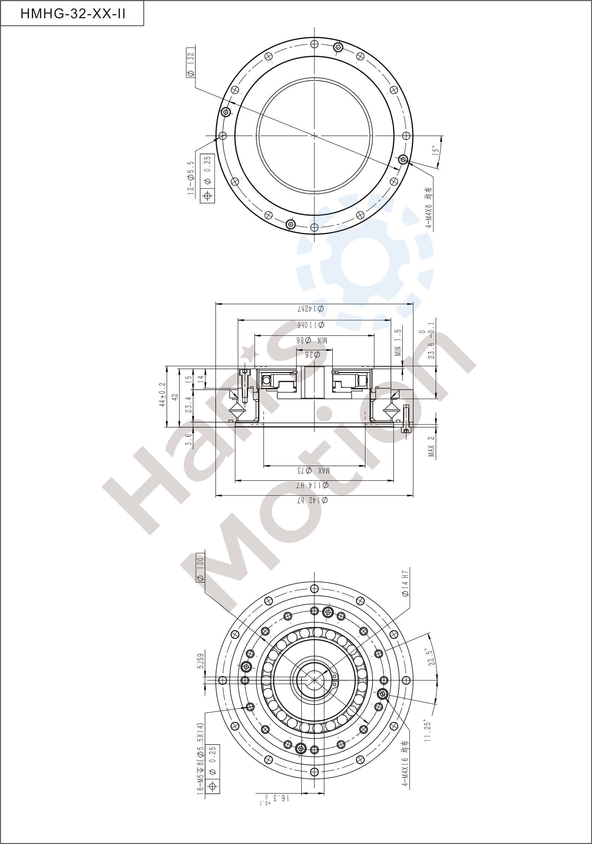 HMHG-II series flexible gear belongs to hollow flanging standard structure and the whole structure is compact. Its input shaft connects with inner hole of wave generator through Oldham coupling.The reducer can be used in two methods:rigid gear is fixed and flexible gear doesoutput; or flexible gear is fixed and rigid gear does output.