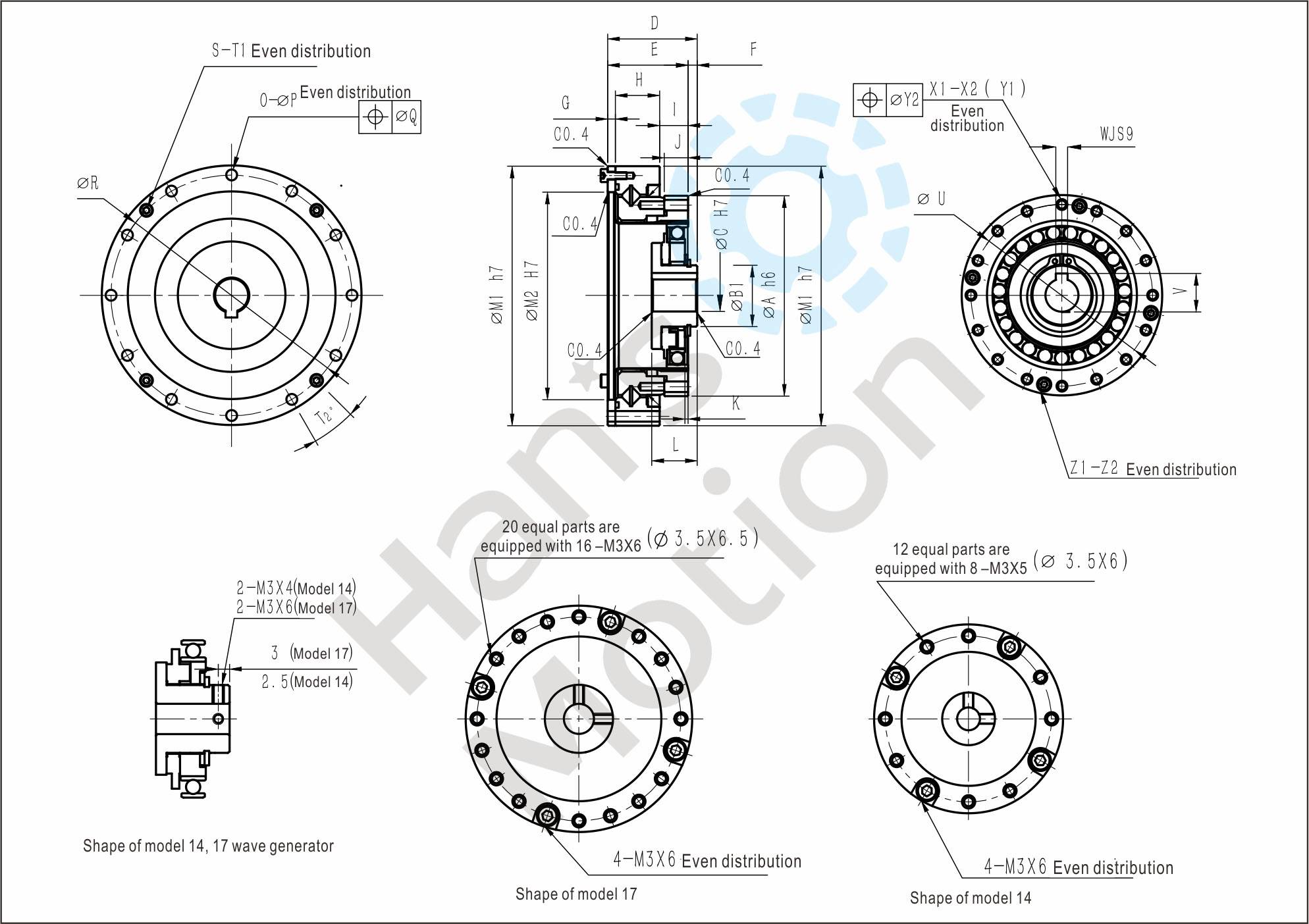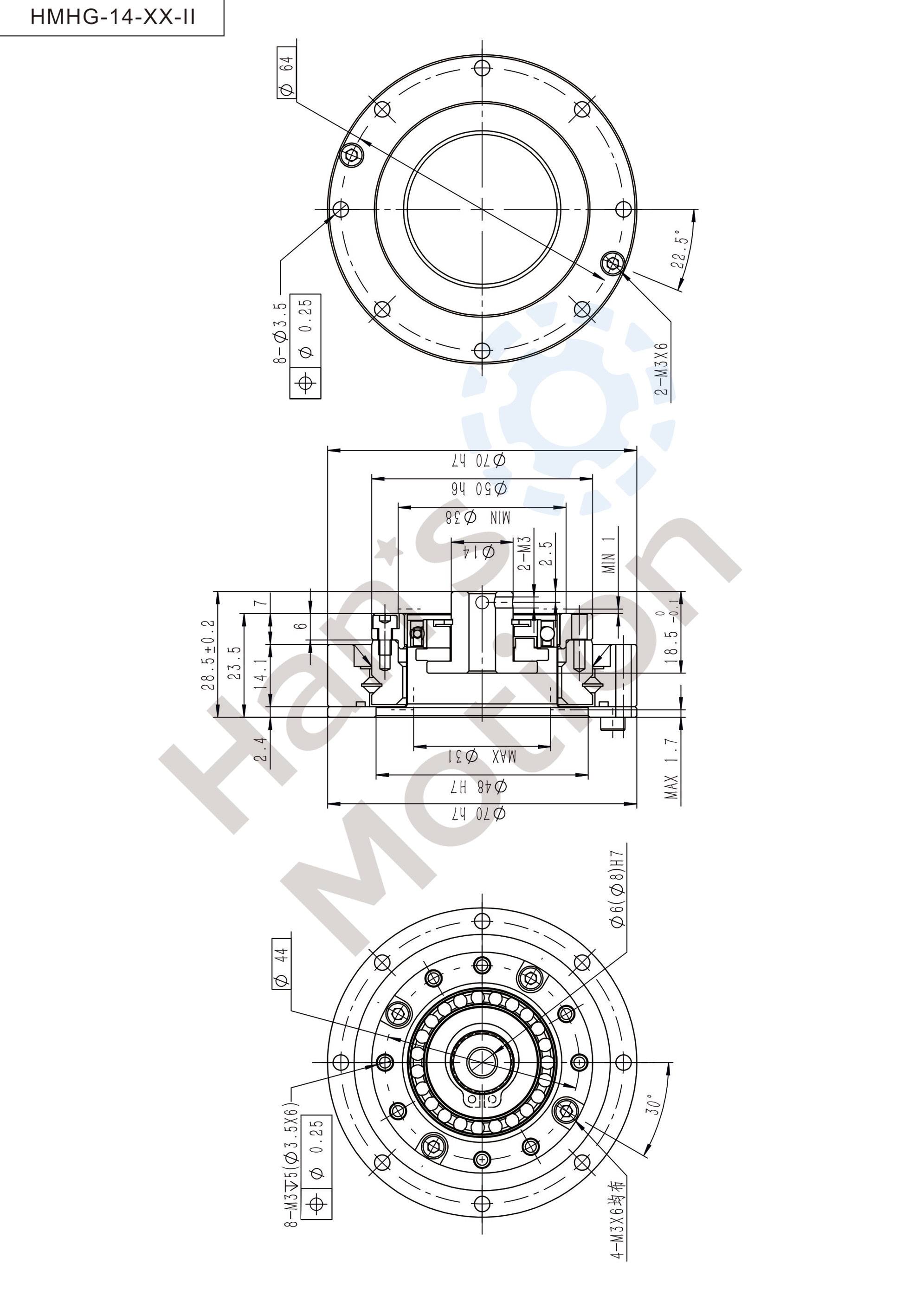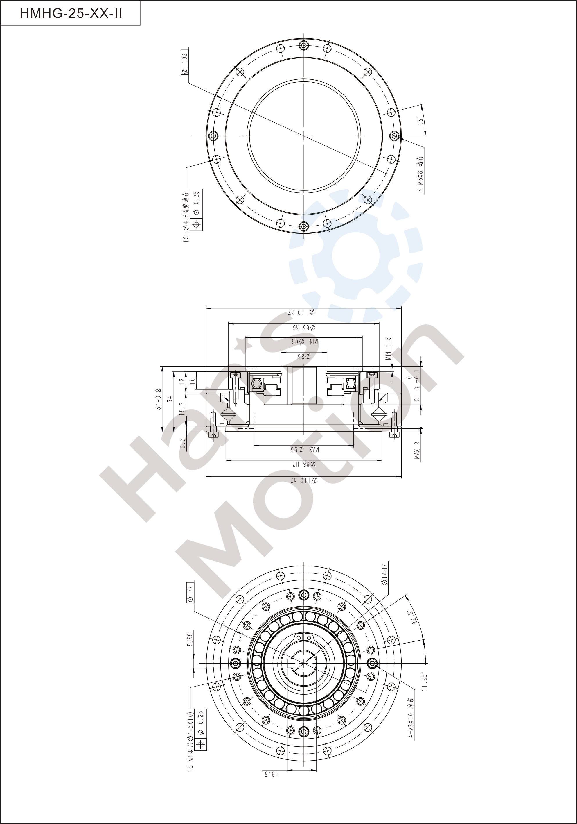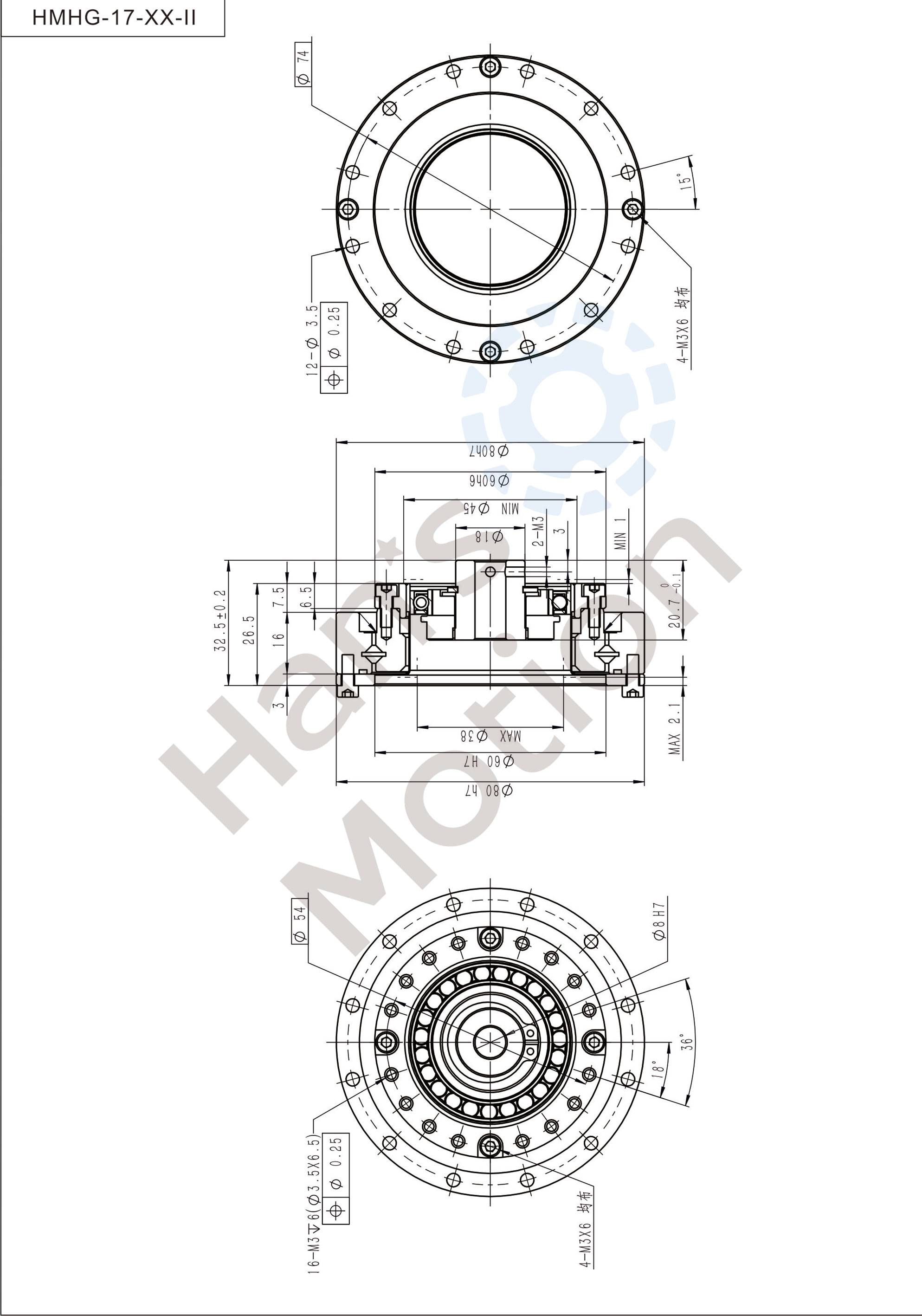 HMHG-II series flexible gear belongs to hollow flanging standard structure and the whole structure is compact. Its input shaft connects with inner hole of wave generator through Oldham coupling.The reducer can be used in two methods:rigid gear is fixed and flexible gear doesoutput; or flexible gear is fixed and rigid gear does output.