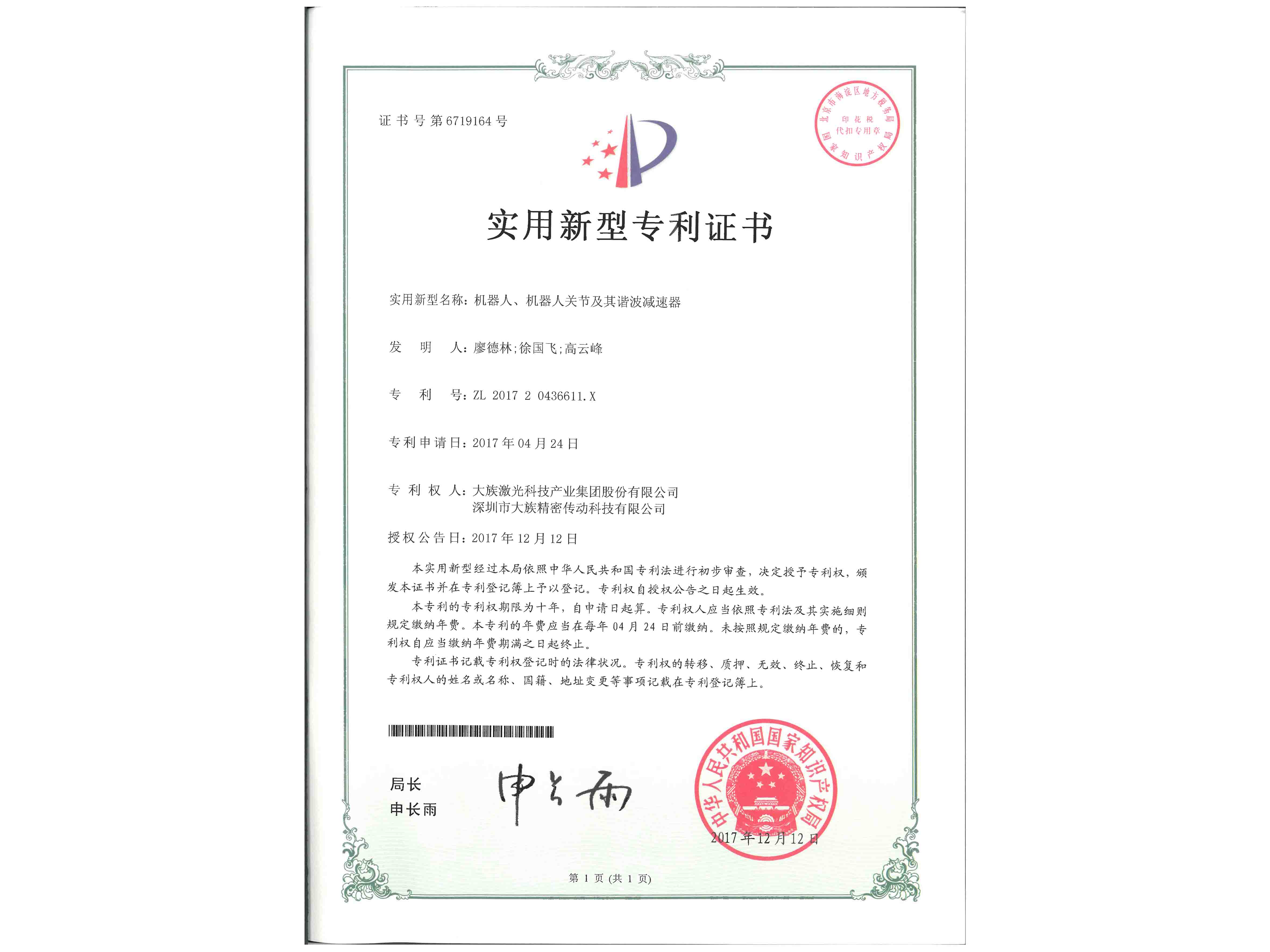 专利证书(机器人、机器人关节及其谐波减速器)