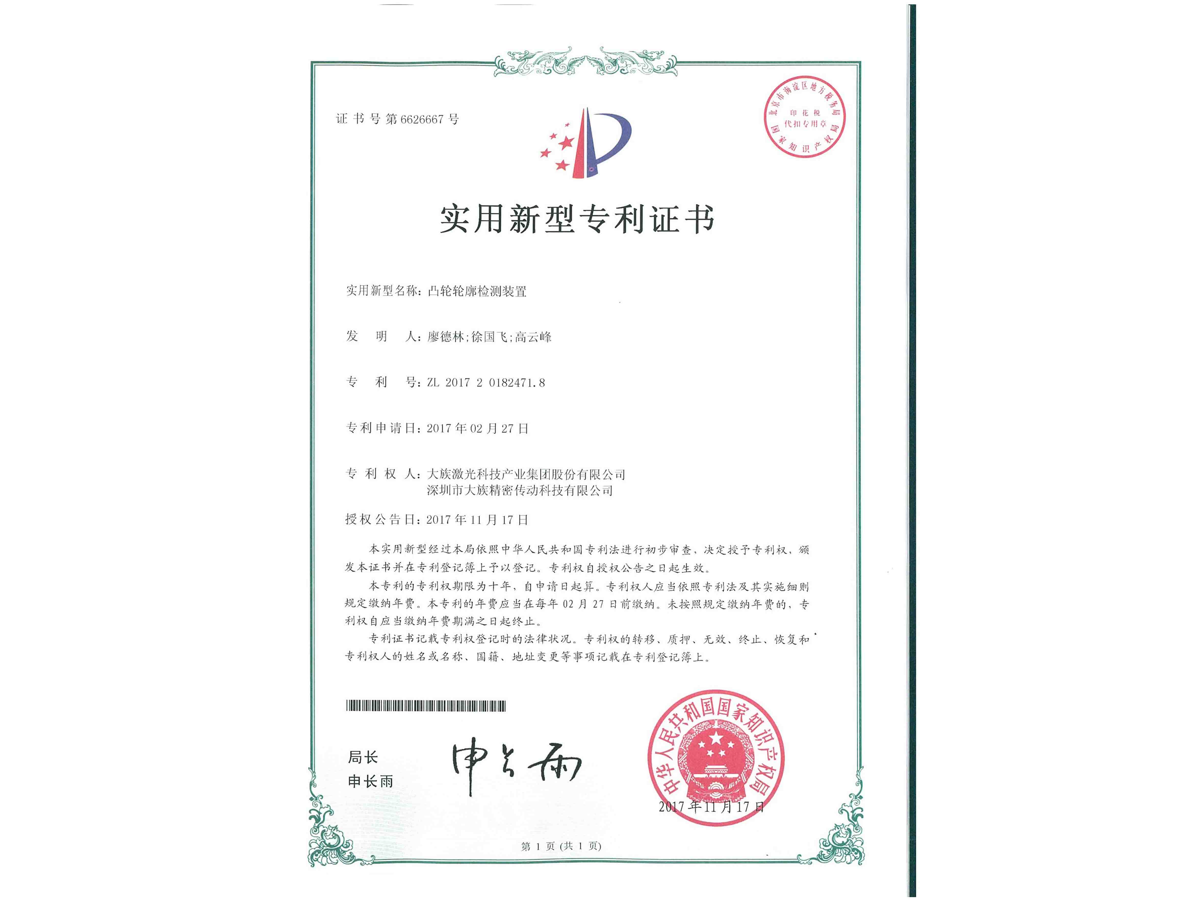 专利证书(凸轮轮廓检测装置)