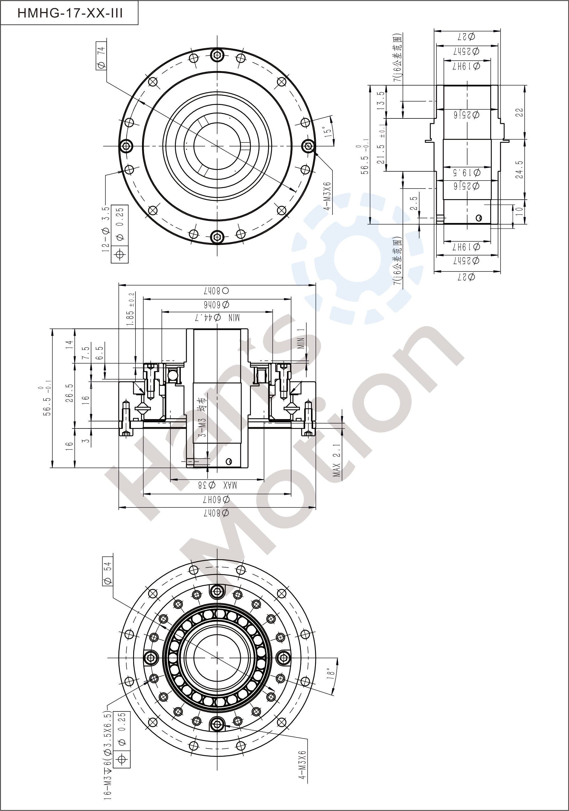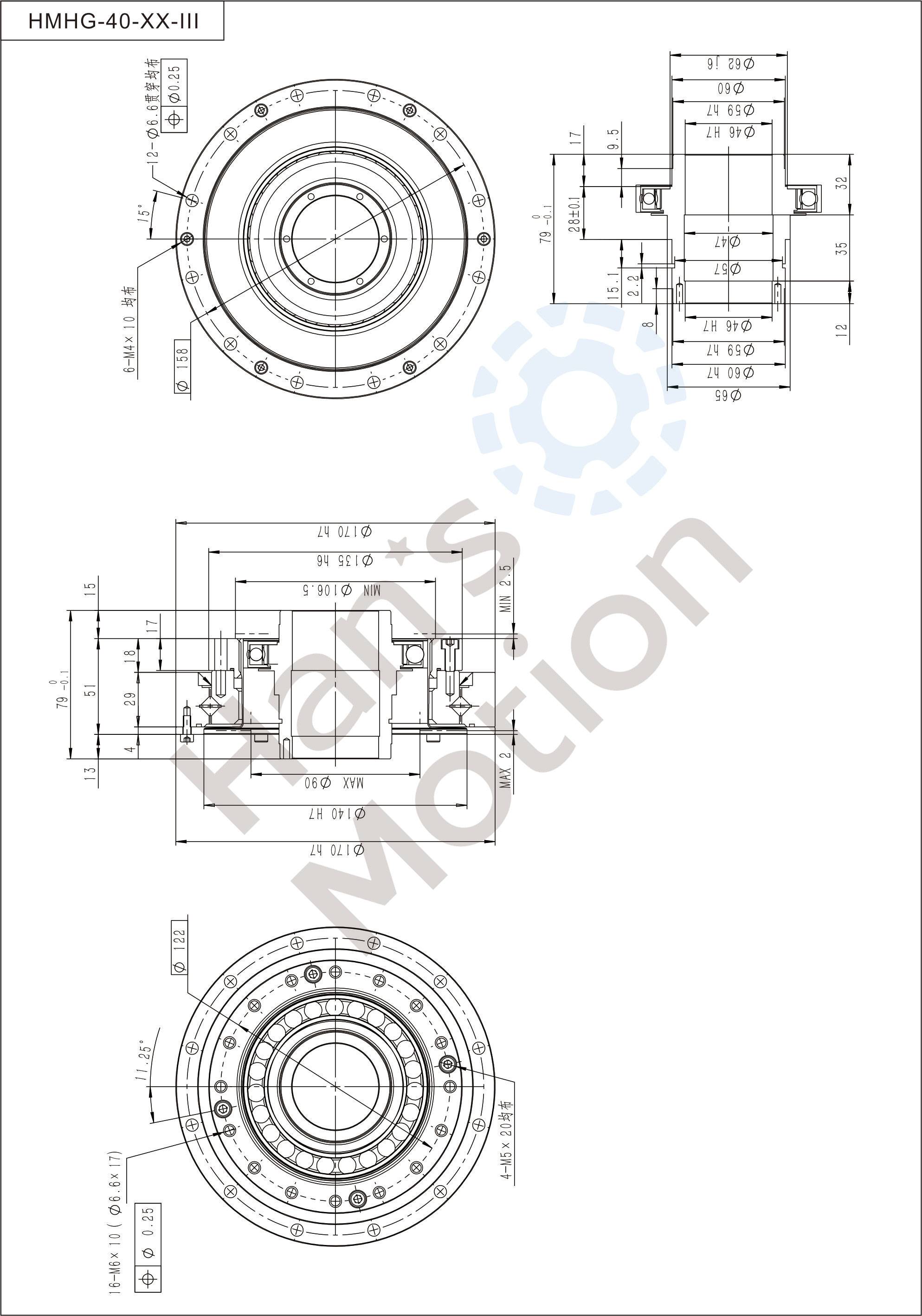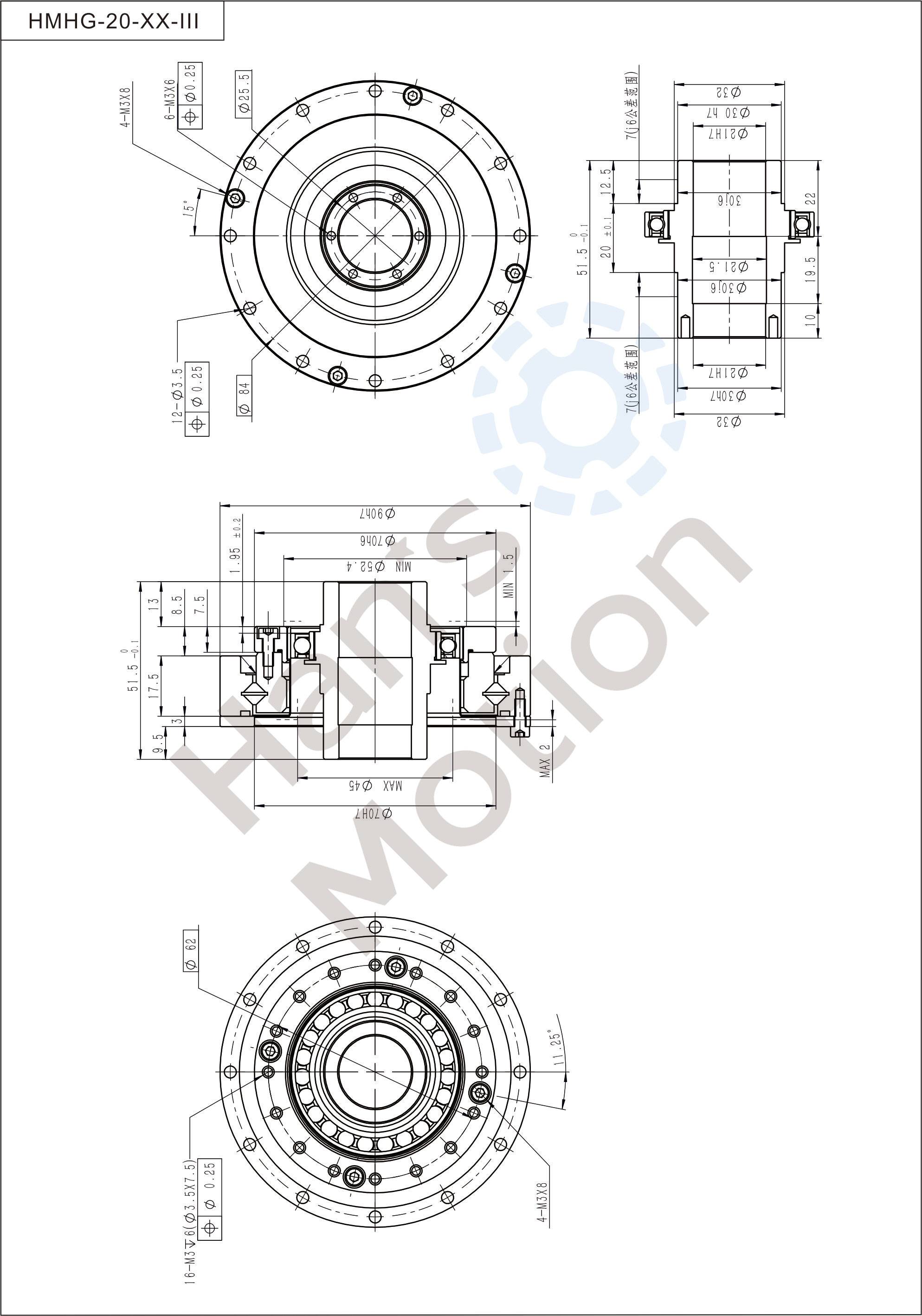 HMHG-Ⅲ系列柔轮为中空翻边形标准结构,整机结构紧凑,波发生器为大口径中空轴,带有交叉滚子轴承,来承受径向与轴向的负载。此结构为简易型,方便用户定制安装。