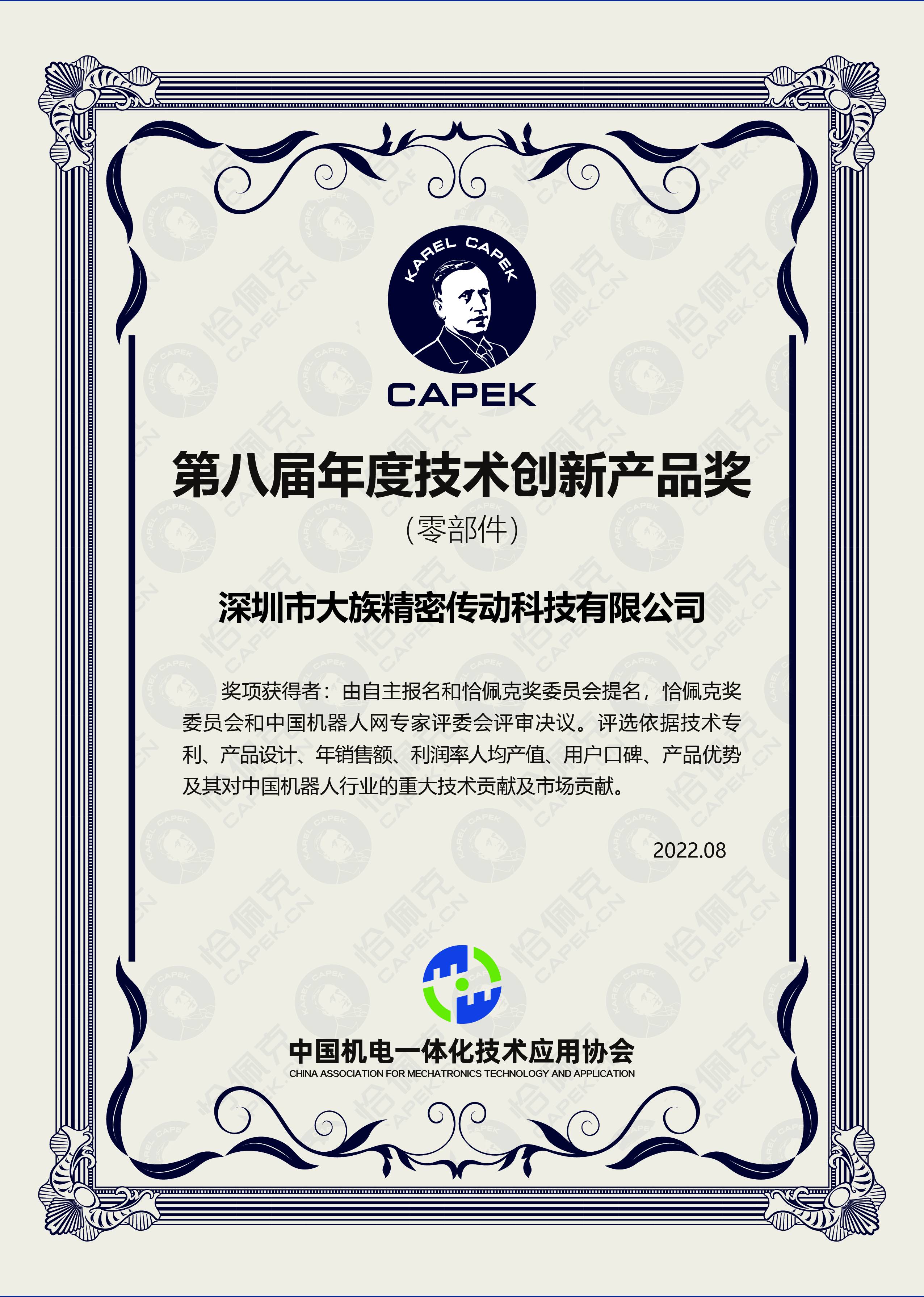 大族谐波传动作为国内专注于精密谐波减速器研发生产的企业,凭借自主研发和创新概 念,产品技术获得重大突破,荣获恰佩克“第八届年度技术创新产品奖”。