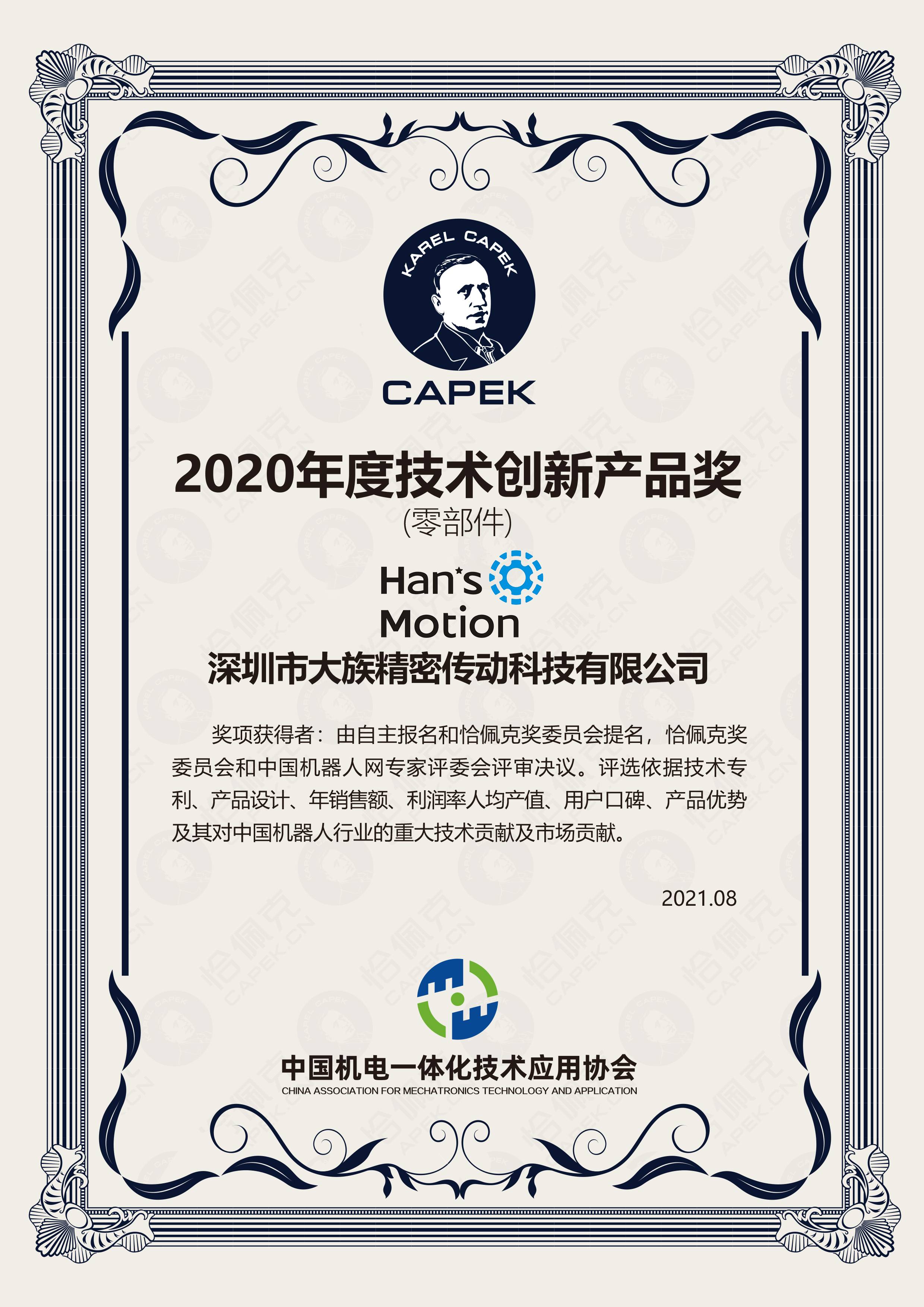 大族谐波传动作为专业研发生产的谐波减速器企业,凭借自主研发和创新概念,产品技术获得重大突破,再次荣获恰佩克“2020年度技术创新产品奖”。